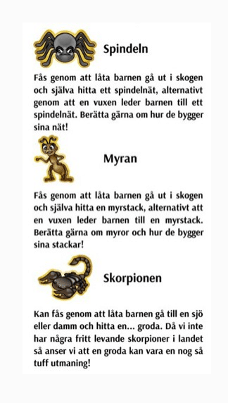 Myran, Spindeln och Skorpionen. Dessa märken erhålls genom äventyr för barnen! Beskrivningarna under respektive märke är ett förslag och du väljer själv vad som ska krävas.