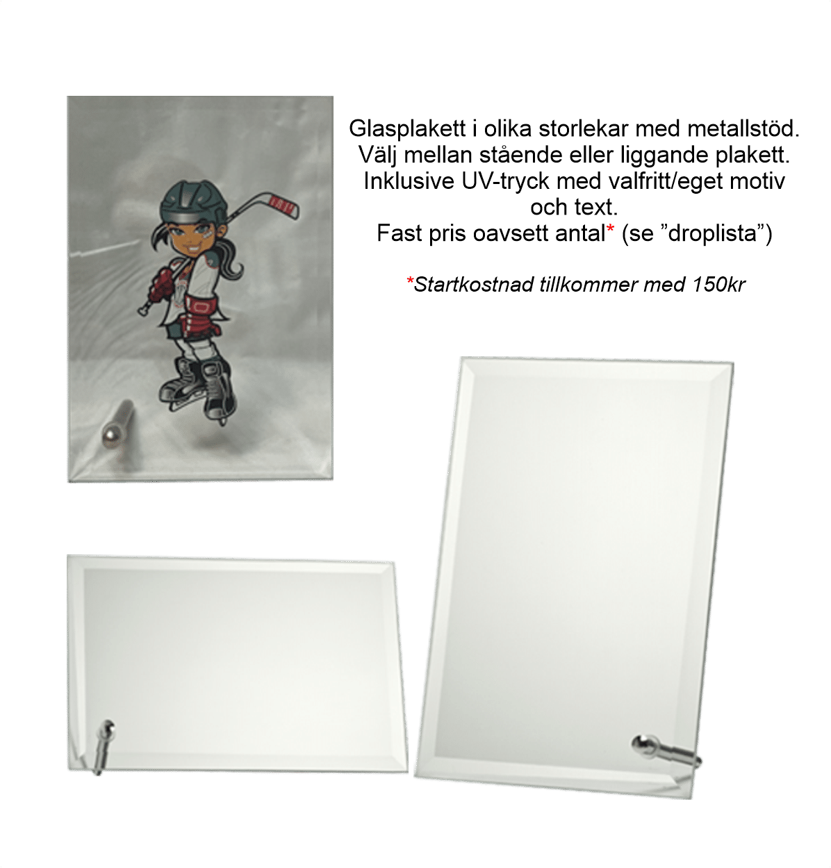 Glasplakett i olika storlekar med metallstöd