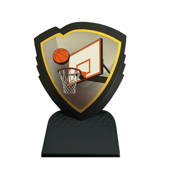 Sköldformad statyett i plast med basketmotiv