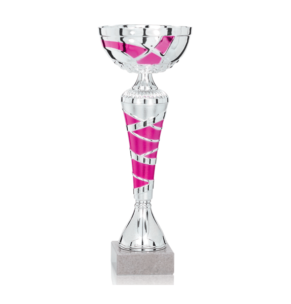 Silverfärgad pokal med rosa detaljer, grå marmorsockel.