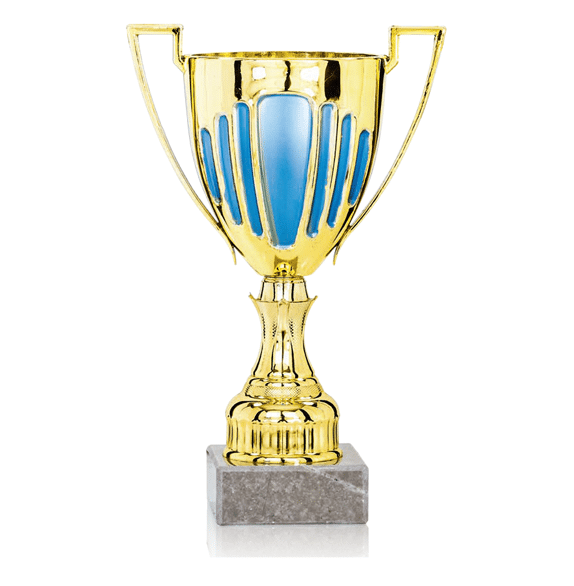 Guldfärgad kupa med ljusblåa detaljer i plast, grå marmorsockel